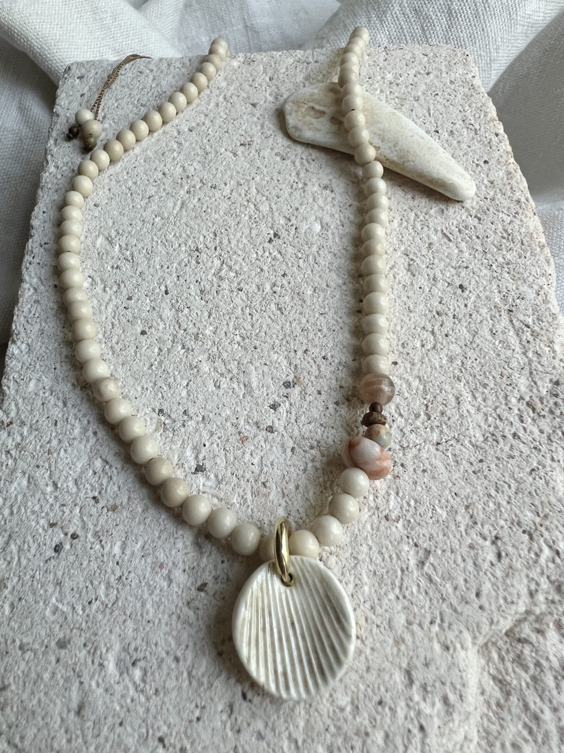 Naszyjnik z kamieni rzecznych, jaspisu, słonecznego i hematytu. Skomponowany z ręcznie wykonaną, unikatową,  porcelanową zawieszką w kształcie muszli.